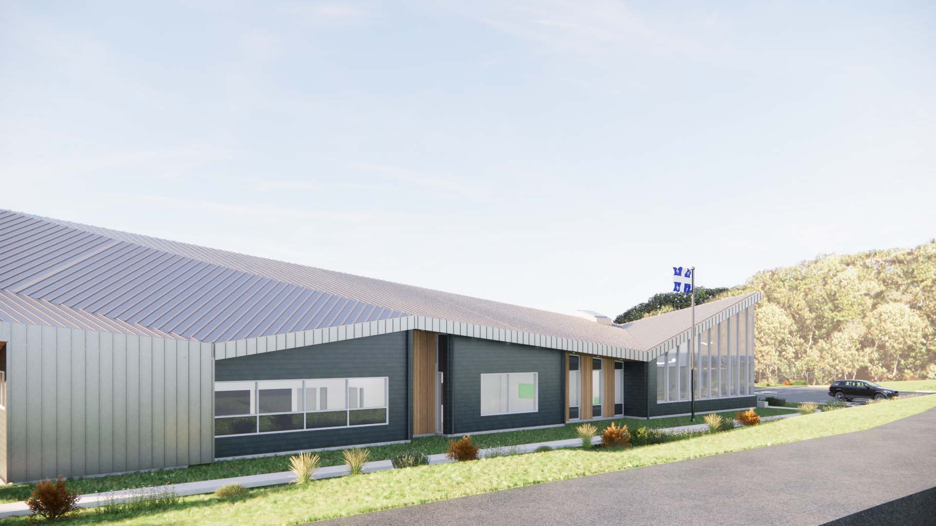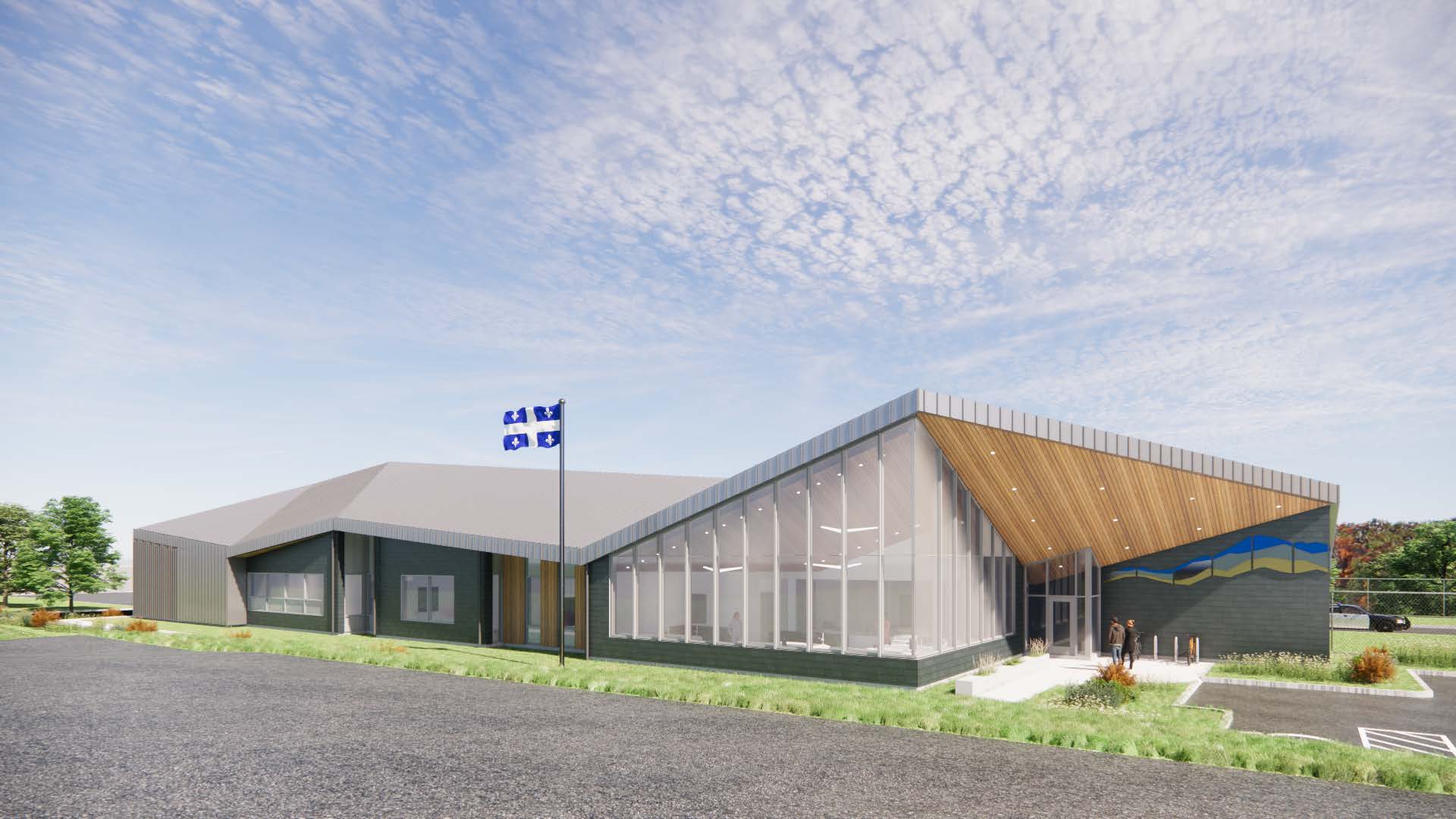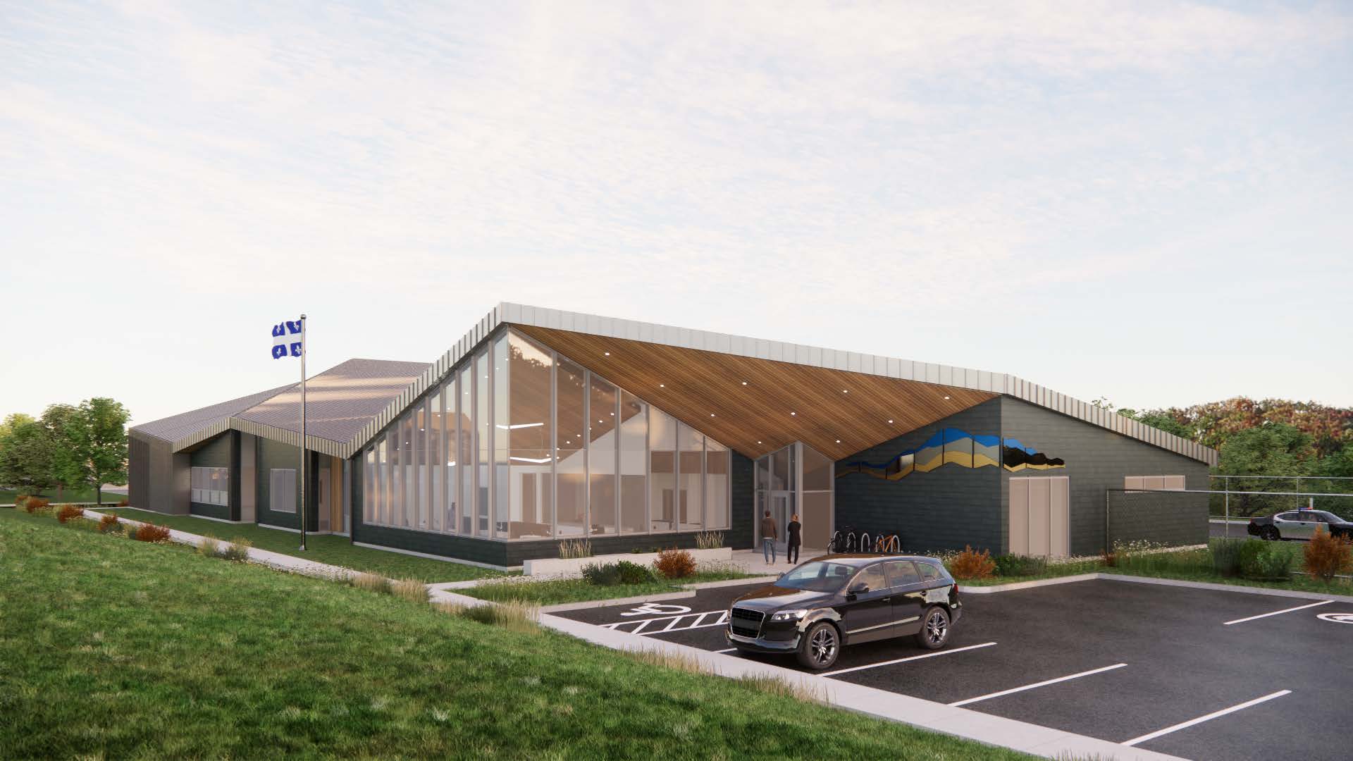 Des bornes de recharge pour les véhicules électriques seront disponibles. Une œuvre d’art signée par l’artiste multidisciplinaire Jacques Desruisseaux, évoquant un paysage de montagne segmenté, égaiera les murs extérieurs du bâtiment à proximité de l’entrée réservée aux visiteurs.